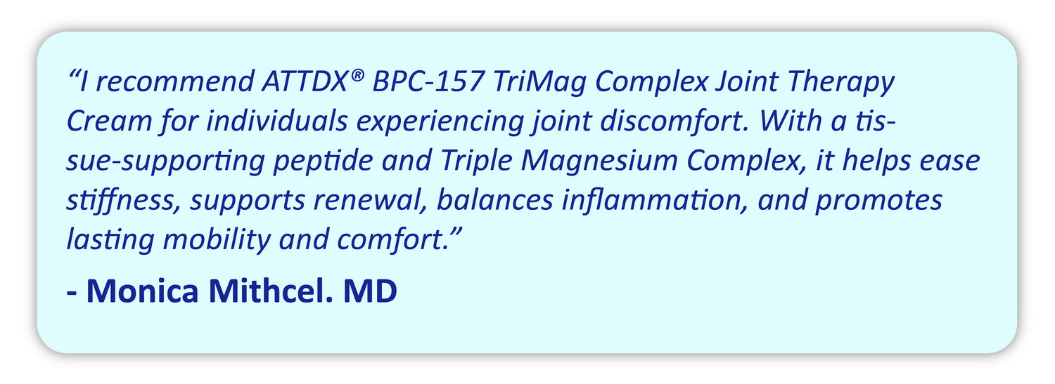 ATTDX® BPC-157 TriMag Complex Joint Therapy Cream is infused with these ingredients to provide multi-pathway support, delivering soothing relief while promoting long-term joint strength and mobility.