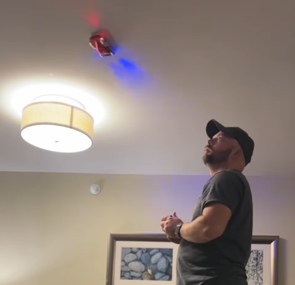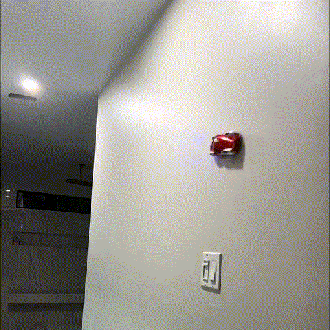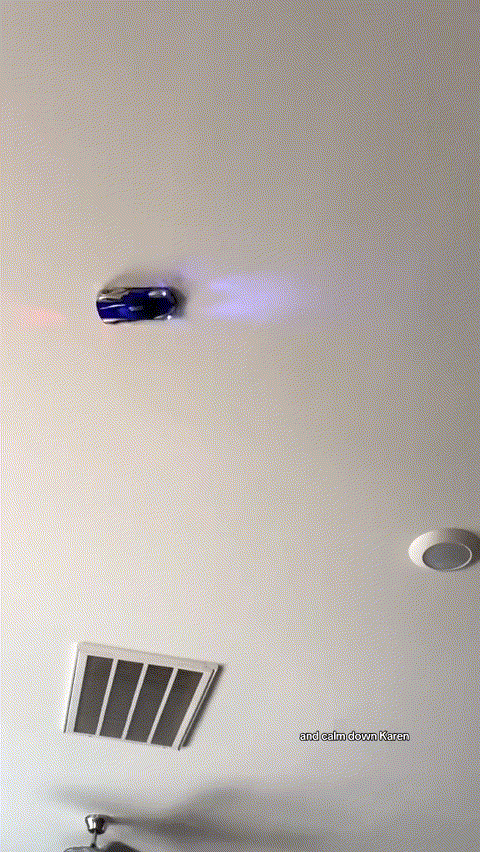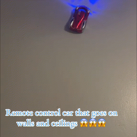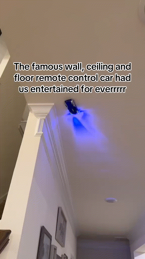 It uses strong magnetic and vacuum technology to securely stick to most smooth ceilings and won't fall under normal use. Avoid high-speed driving on damp or uneven surfaces.