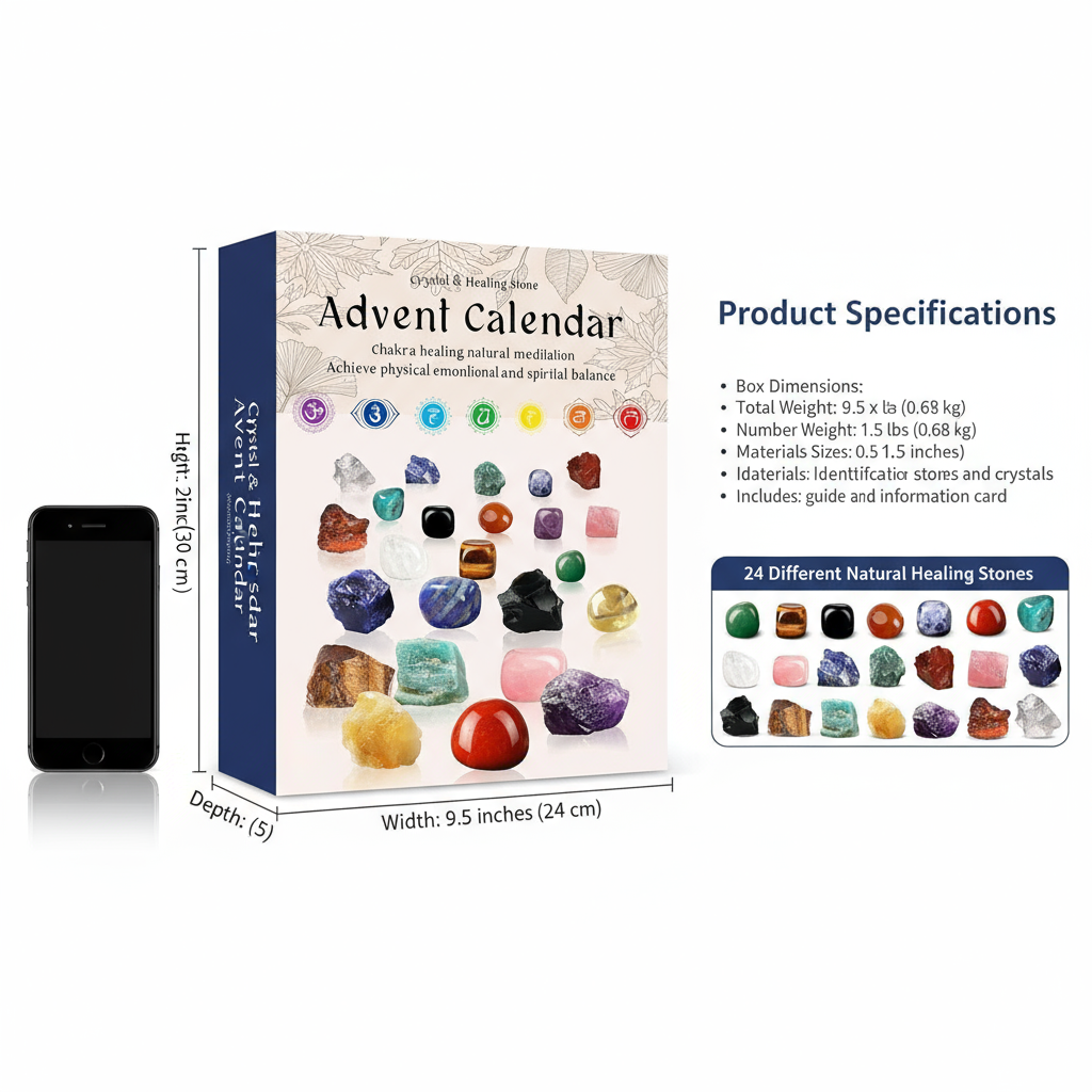 This enchanting Christmas box contains 24 hand-selected natural crystals,each chosen for its beauty, energy, and symbolic power.