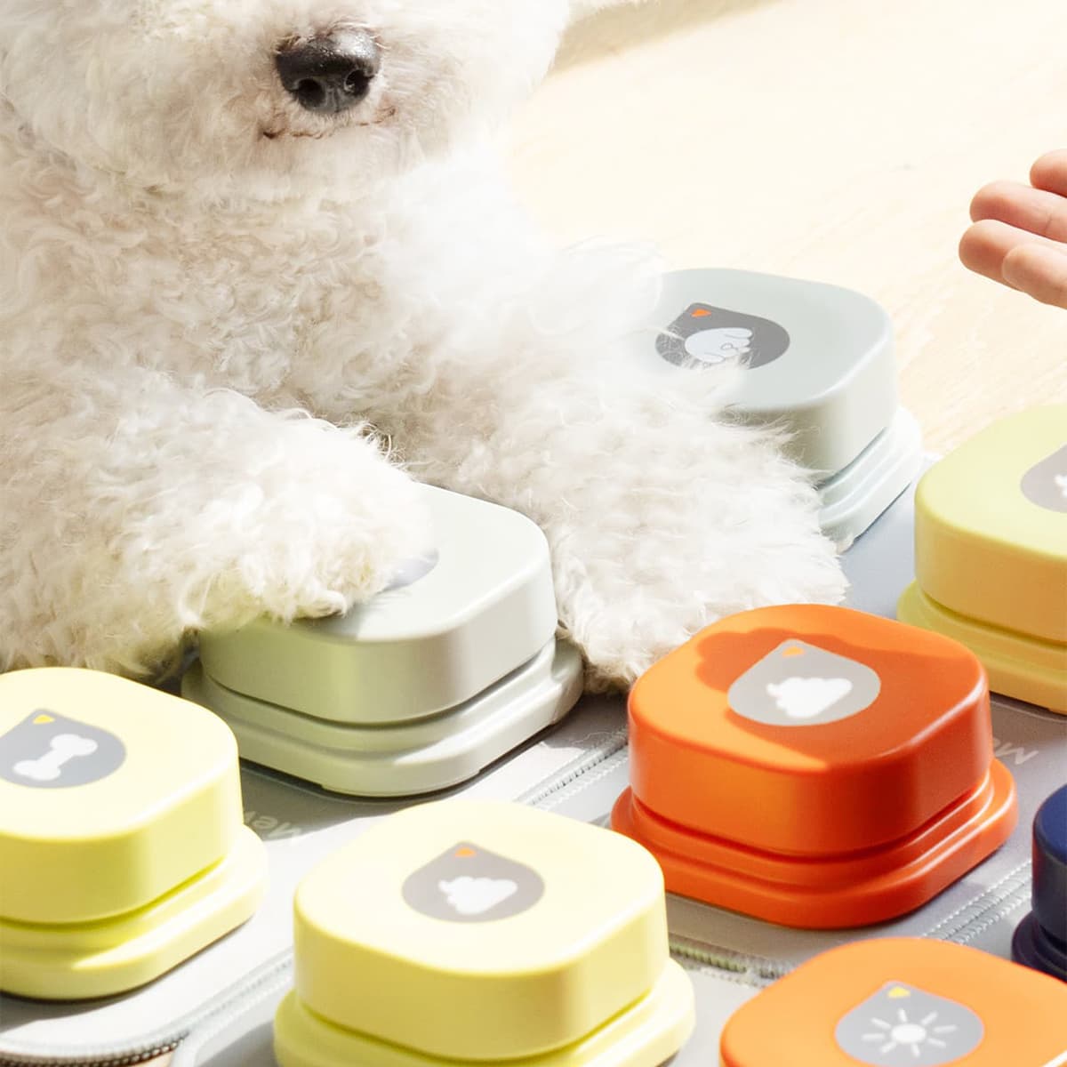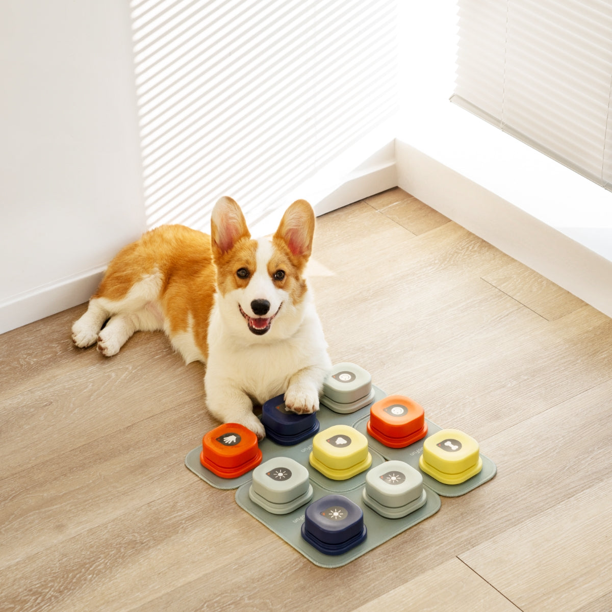 9-Pack Dog Talking Buttons, combining I, T, and L Pieces into a Square Piece, simplify pet communication. Record messages or commands with high-quality sound on a non-skid mat with strong Velcro. Made from durable ABS plastic and rubber, these tools enhance training and interaction with your dog.?