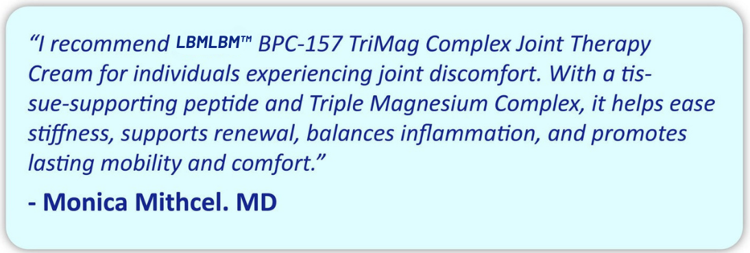 LBMLBM™ BPC-157 TriMag Complex Joint Therapy Cream combines medical-grade BPC-157 peptide (≥99.2% purity) with a Triple Magnesium Complex of glycinate, malate, and citrate — a breakthrough blend designed to restore joint health at the cellular level.