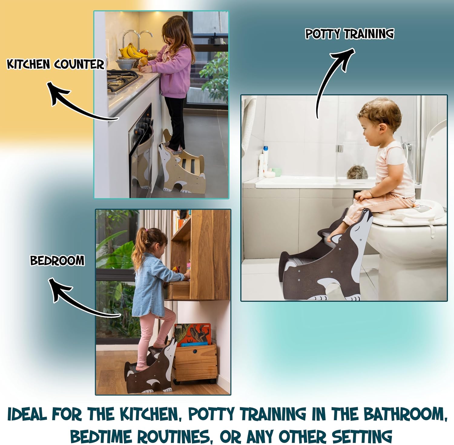 - Multiple uses♻️: Our wood step stool for kids, can be used as a kids step stools for toddlers bathroom , as a kitchen stool for toddlers or anywhere your little one might need a little help!